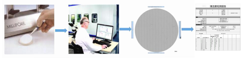 通过清洁度检测分析软件控制电子影像设备和光学放大设备,对清洗萃取后的滤纸或滤膜样本进行高精度扫描,将扫描数据传回至计算机分析软件,分析软件自动识别金属、非金属、纤维颗粒等,生成清洁度检测报告。